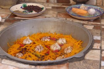 Dîner (inclus) dans la maison d’hôte, aide à la préparation du «pilaf», plat traditionnel, au dîner, chez l’habitant. Le «pilaf ou plov», plat à base de riz cuit avec des raisins, des pois chiches, des épices, des carottes jaunes et de la viande. Vous préparerez le dîner avec eux tout en apprenant à cuisiner des spécialités locales. Vous dégusterez ensuite en compagnie de la famille ce repas, servi sur le “dastourkhon” (nappe traditionnelle) qu’on partage avec les membres de famille dans la cour sous les ceps de vigne. Cette journée vous permettra de vous imprégner du mode de vie locale et de découvrir leur hospitalité.