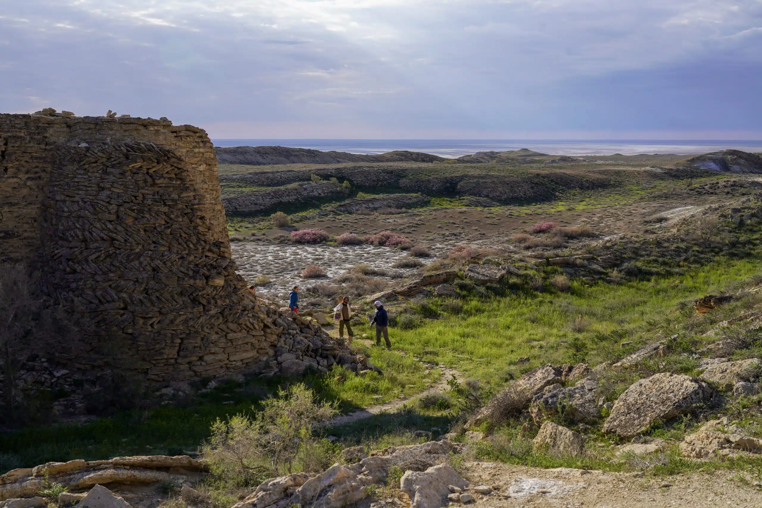 Déjeuner pique-nique au bord du lac. Anciennement d’eau douce, le lac est devenu de moins en moins profond, et de plus en plus salé. Les gens ont abandonné les villages voisins, le poisson est devenu moins abondant, bien que des apports en eau remplissent parfois le lac et empêchent la disparition complète des poissons et des oiseaux migrateurs. Quelques anciens phares faits de briques de boue et disséminés le long des anciennes rives étaient utilisés pour aider les pêcheurs à retrouver leur chemin. Il est possible de voir une colonie russe et polonaise abandonnée de l’ère stalinienne, les ruines d’un hôpital, de maisons et d’une ancienne usine de poisson. Aujourd’hui, une maison de pêcheurs est encore debout, les vestiges tristes de l’ancienne gloire.